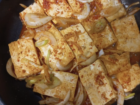 이 과정을 거치면 두부 표면에 양념이 스며듭니다. 그냥 끓이는 것과는 완전히 다른 맛이 납니다. 겉은 촉촉하고 속은 간이 배어 있는 두부조림이 완성됩니다.