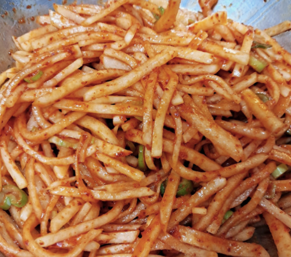A. 김치용 고춧가루(중간 굵기)가 제일 좋아요. 너무 고우면 무에 달라붙어서 색이 진해지고, 너무 굵으면 양념이 잘 안 배어요.