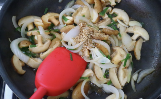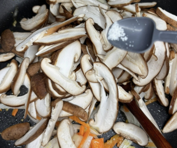 - 버섯이 노릇해지고 수분이 날아가면 양파 넣고 1분 더 볶기